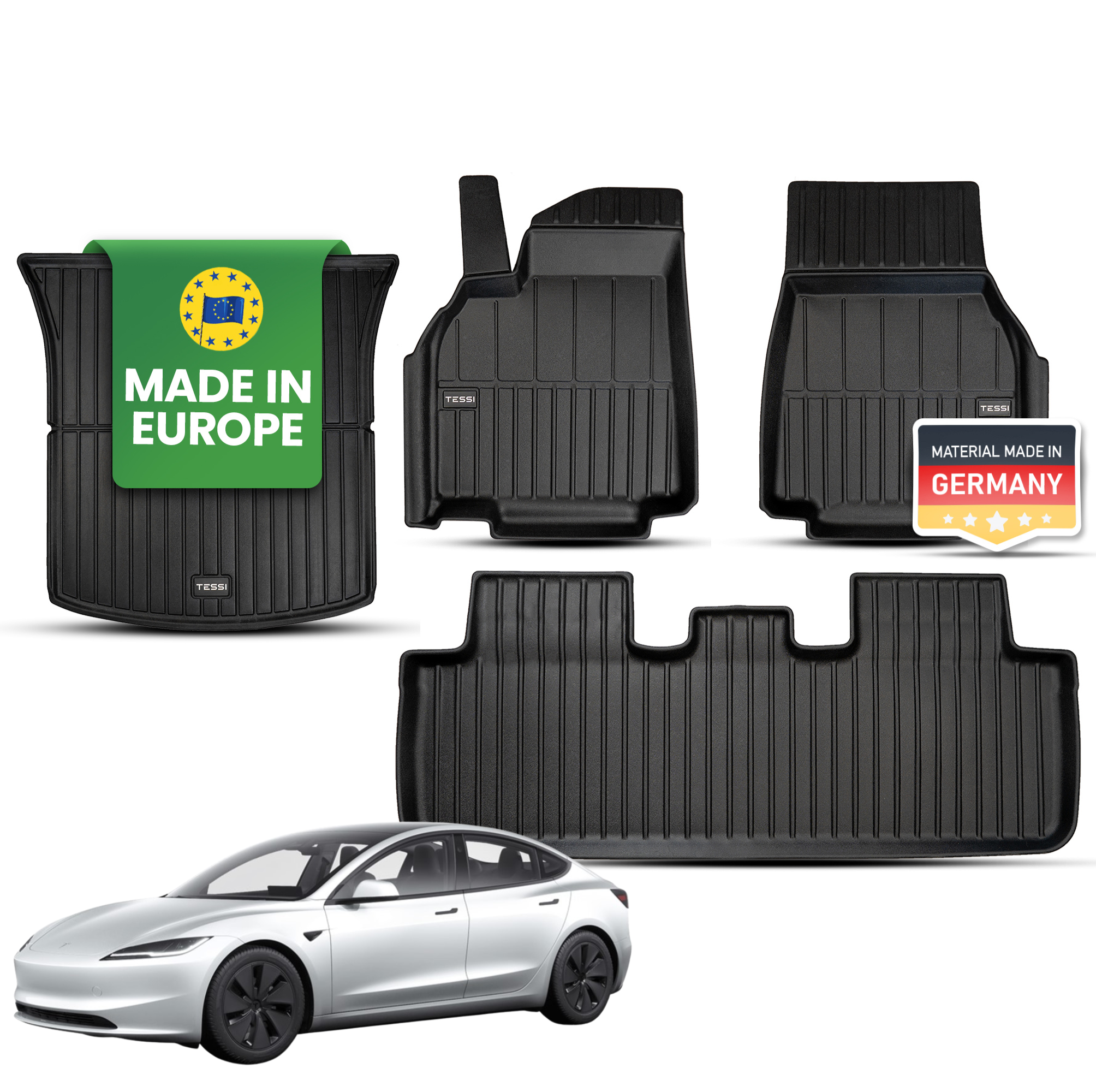 Tesla Model 3 Highland 4-teiliges Gummimattenset Innenraum Tessi® Greenline 75% Recycling Material Tesla Model 3 Highland 4-teiliges Gummimattenset Innenraum Tessi® Greenline 75% Recycling Material